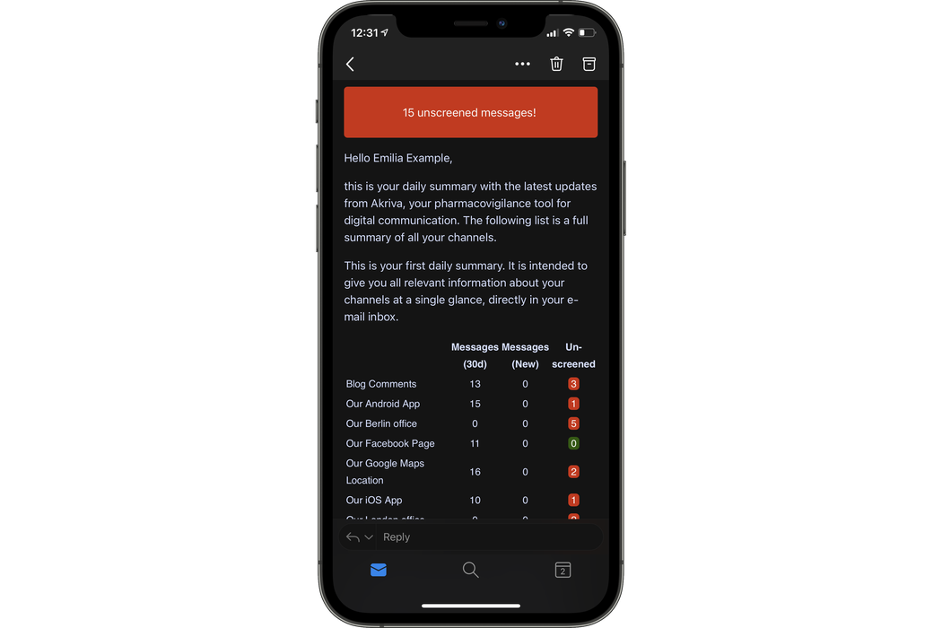 - Klare Farbkodierungen zeigen an, ob Nachrichten bereits gescreent wurden.